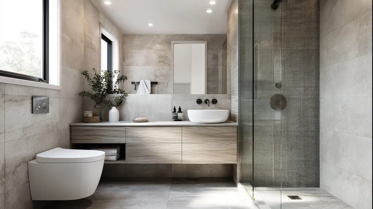 Choose materials that look good when life happens. Porcelain, sealed stone, and microcement resist moisture and clean quickly. Floating vanities and wall-hung fixtures make mopping simple — no corners for dust or water to collect.