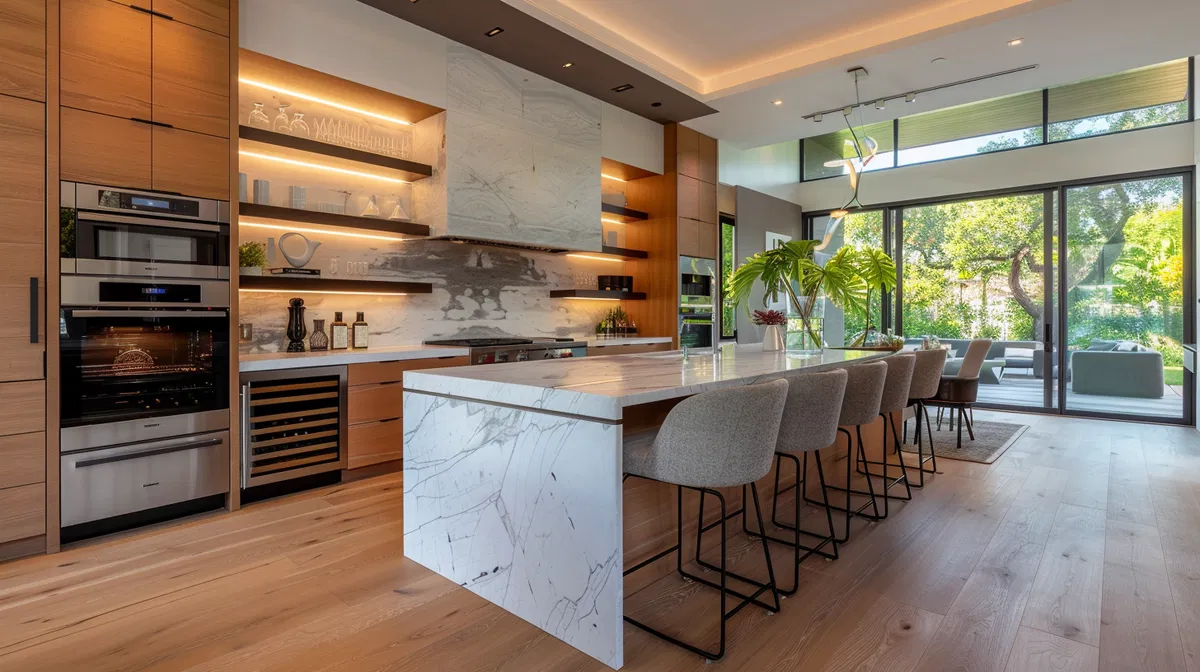 The island is both a sculpture and a toolbox. From the dining side, it should read as furniture — calm, elegant, uninterrupted. From the prep side, it should quietly reveal its working soul.